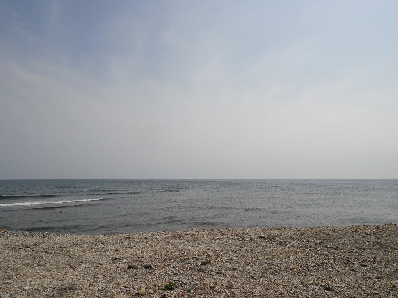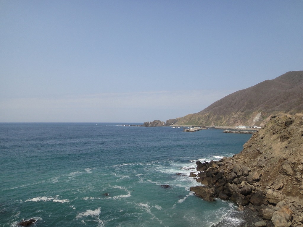 温泉で休息後、岬巡りを再開。走行中に路面を横断する蝶 の幼虫を何度も確認。小さな虫の一歩が、春の訪れを知ら せていました。 こちらは北追岬から望む日本海。
