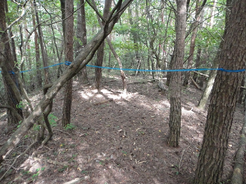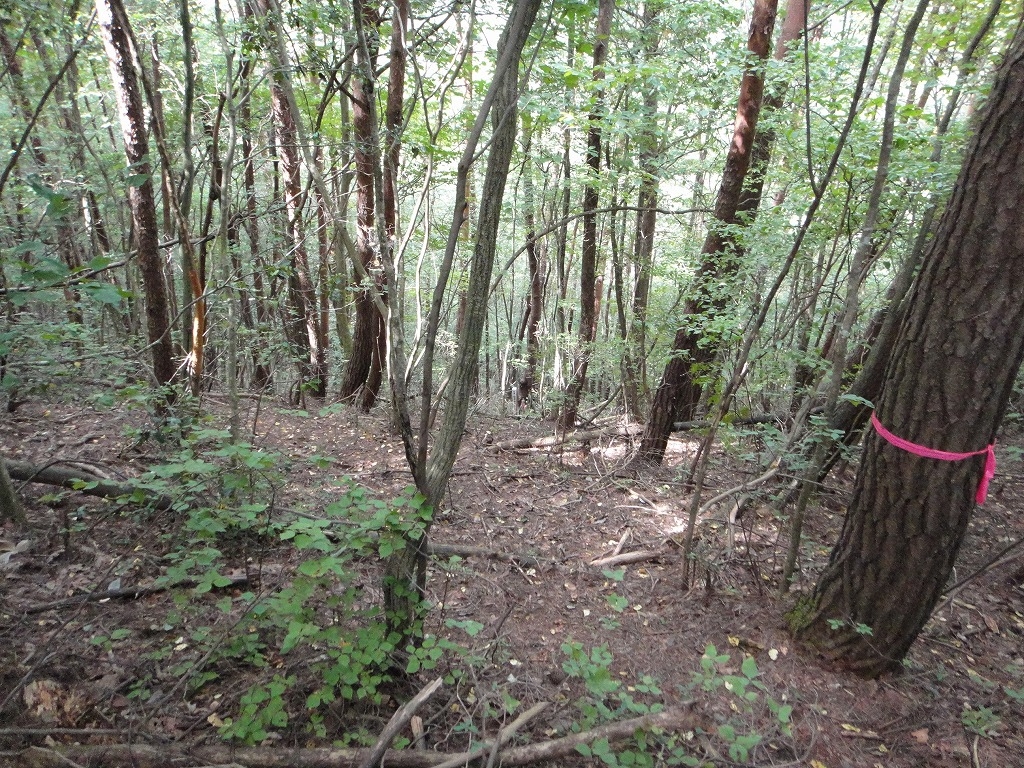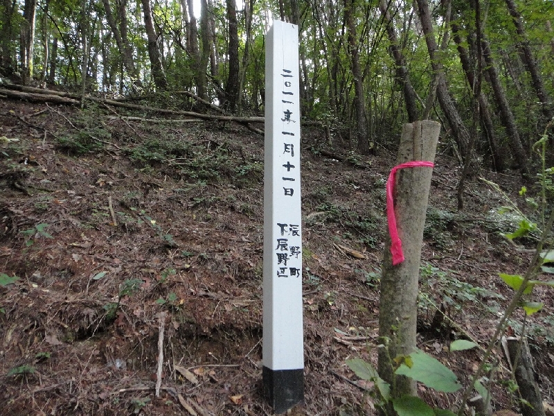 木に巻かれた赤いロープが、近くに標柱があることを確信。